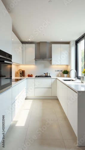 Open-plan contemporary kitchen, bright white, integrated appliances, counter, home