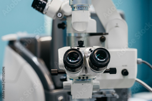 Ophthalmology microscope with dual lenses positioned in a clinical setting, showcasing advanced technology for vision examination and laser vision correction procedures