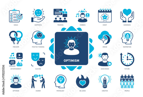 Optimism icon set. Happiness, Goodness, Entertainment, Culture, Positive Thinking, Humor, Freedom, Inspiration. Duotone color solid icons