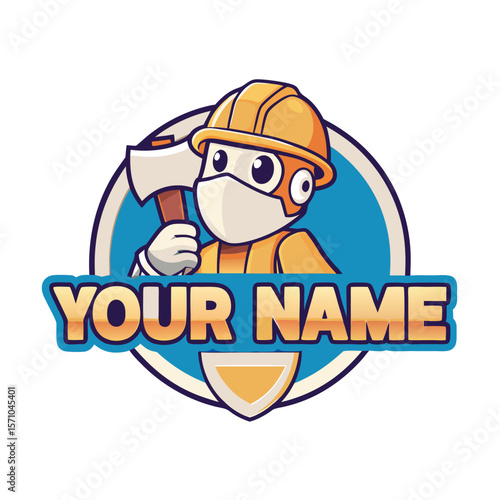 character, cartoon, logotype, axe, helmet, mask, construction, men at work, safety, protection, industrial, strong, powerful, cute, friendly, simple, modern, design, graphic, branding, business, identity, playful, colourful, creative, fun, children, technology, robot, engineer, blue, orange, yellow, white, beige, circle, shield, name