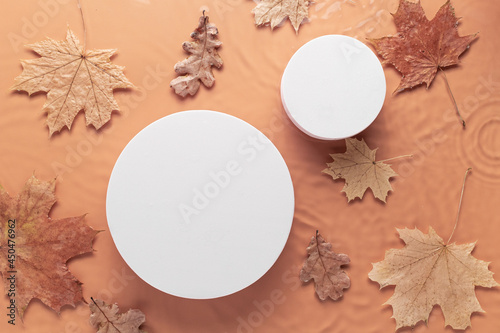 Orange and yellow cosmetic background with autumn leaves. White trendy podiums for cosmetic on blurred transparent clear calm water surface with splashes and bubbles. Trendy abstract nature template