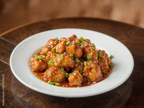 chicken, asian cuisine, chinese food, accessing, meal, food, delicious, savoury, sweet, sauce, glaze, sesame seeds, scallion, green onion, garnish, plate, white plate, closeup, serving, eatery, cookery, fried, crispy, cooked, dinner, lunch, oriental