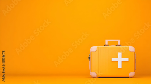 first aid kit, suitcase, orange background, medicals, health, travel, emergency, preparedness, safety, baggage, minimalism, bright, colourful, aid, kit, vacation, trip, health care, medicine, protection, security, rescue, help, assistance, packing, holiday, journey, adventure, exploration, wellness, treatment, make well, prevention, prepared, responsive, equipment, supply, bag, case, portable, convenient, essential