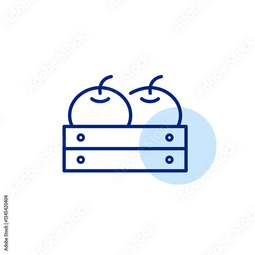 Orange in wooden crate. Organic vegetables, green farmer produce. Fresh groceries, shopping and vegetarian diet. Pixel perfect, editable stroke vector icon