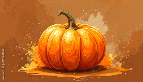 Orange pumpkin illustration with splashes on a brown background. Festive fall gourd picture for autumn holiday decor on earth tone backdrop.