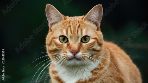 Orange tabby cat with striking green eyes and white chest fur, positioned centrally against a dark green blurred background.