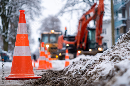 traffic, cone, construction, machinery, snow, winter, urban, development, roadwork, safety, equipment, excavation, infrastructure, city, environment, cold, worksite, visibility, caution, orange, landscape, seasonal, digging, project, maintenance, transportation, public, area, service, labor, tool, heavy, vehicle, site, progress, engineering, activity, scene, weather, condition, sharpened, detail, planning, management