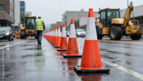 Orange traffic cones line a wet urban street, with a construction worker and machinery in the background under overcast skies.