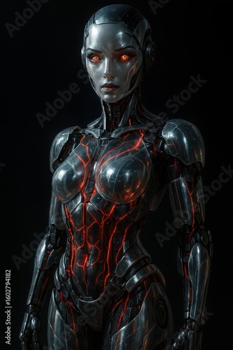 robot, cyborg, android, female, armoring, plating, torso, chest, core, reactor, circuit, circuitry, vein, energy, glow, orange, ember, eye, yellow, mechanical, metallic, steel, alloy, futuristic, science fiction, sentinel, warrior, guardian, dark, illuminated, filigree, neural, synthetic, artificial, internal, network, tubular, joint, exoskeleton, structure, scratch, moody, dramatic, portrait, bust, detailed