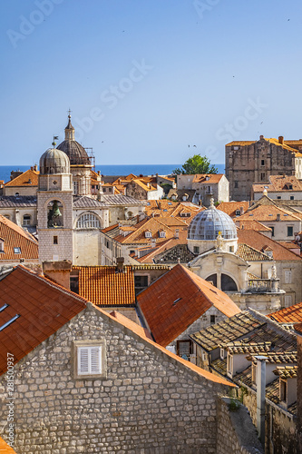 Orange-tiled roofs of the magnificent Old Town of Dubrovnik from the City Walls. Dubrovnik, Mediterranean, Croatia.