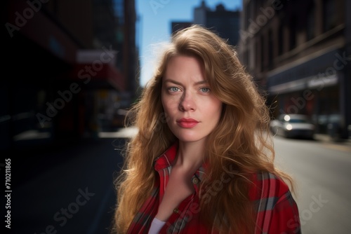 Ordinary woman on city street serious face