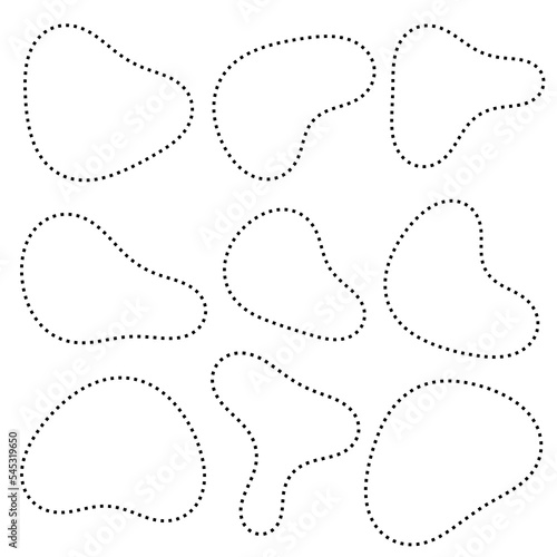 Organic abstract random blob shapes in dashes or dotted line. outline design. Outline fluid irregular shape element. Liquid spot silhouette, water frame, bubble outline, irregular oval, random shape.