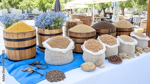 background, food, nourishment, table, blue, organic, nut, chickpea, produce, countryside, bean, barley, rustic, product, texture, agriculture, photo, sack, display, farmer, harvest, healthy, market, legume, barrel, wheat, lentil, seed, summer, abundance, presentation, corn, wooden, natural, eating, agricultural, burlap, variety, grain, lavandula, flower, stall, local, fresh, scene, diet