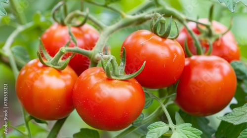 Organic tomato branch with fresh, ripe tomatoes thriving in a greenhouse environment