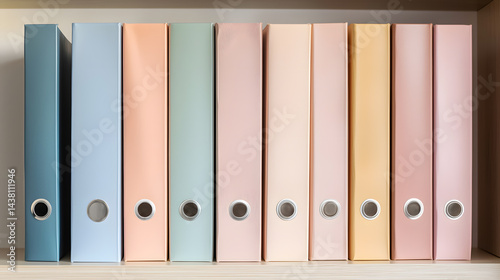 Organized pastel folder collection home office shelf digital image morning light close-up view aesthetic arrangement