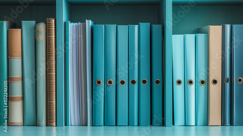 file, folder, teal, blue, organised, office, shelf, storage, document, paperwork, archive, business, administration, order, neat, tidy, efficient, workplace, supply, stationery, binder, filing, management, datum, information, professional, workspace, desktop, background, design, texture, pattern, arrangement, detail, row, line, color palette, water, turquoise