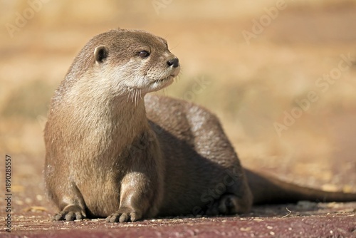 Oriental small-clawed otter (Amblonyx cinerea), adult, recumbent, sand, alert, captive