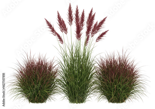 Ornamental grass with red plumes and two bushy grass clumps isolated on transparent background