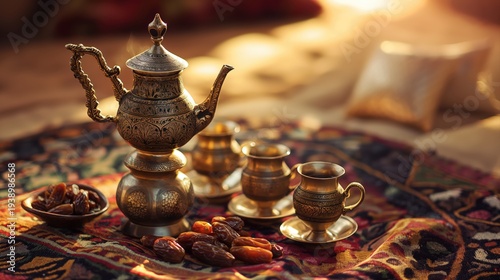 coffeepot, traditional, middle eastern, date, ramadan, eid, hospitality, gold, ornate, metal, antique, cup, saucer, hot drink, steam, dessert, fruit, rug, carpet, patterned, vibrant, warm light, golden hour, sunset, celebration, festive, vintage, ceremony, still life, exotic, rich, elegant, drink