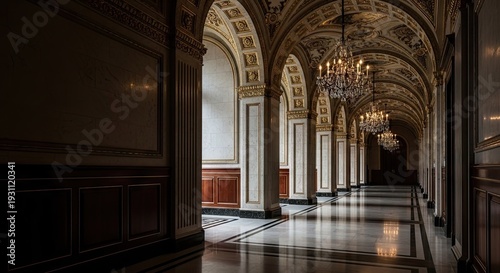 hallway, corridor, archway, chandelier, luxury, elegance, historical, architecture, interior, design, ornate, grand, majestic, lighting, upscale, sophisticated, ornamental, historic building