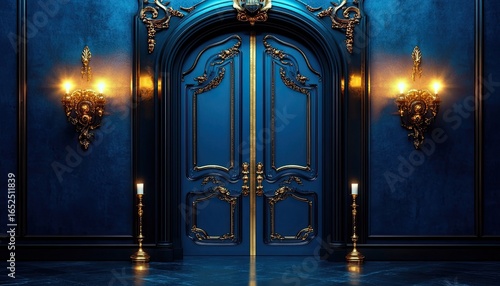 Ornate Blue Doors with Golden Trim and Sconces in Palatial Interior Setting