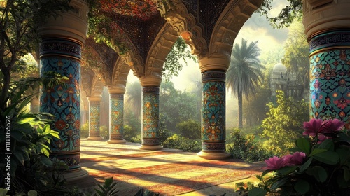 column, ornate, garden, oasis, arch, pillar, mosaic, tile, turquoise, floral, pattern, design, architecture, building, palace, exotic, lush, green, tree, plant, flower, sunlight, shadow, peaceful, serene, tranquil, majestic, grand, beautiful, intricate, detail, vibrant, colours, islam, persian, arabic, muslim, culture, heritage, history, art, landscape, vista