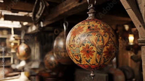 sphere, ornament, design, floral, pattern, hanging, wooden, beam, workshop, antique, decor, art, intricate, detail, warm, colours, vintage, design element, interior, background, closeup, pattern, floral pattern, craft, furniture, isolated, closeup, display