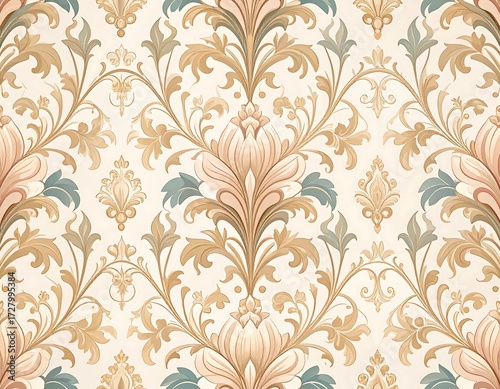 damask, floral, pattern, wallpaper, design, ornate, texture, background, decorative, elegant, classic, vintage, luxury, seamless, tile, art, illustration, graphic, cream, beige, gold, teal, pastel