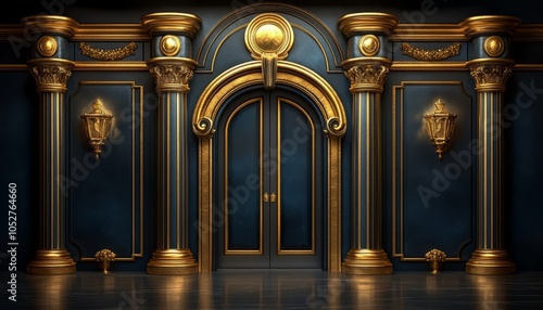 gold, blue, door, doorway, column, arch, frame, ornate, detail, decorative, elegant, classic, luxury, royals, grand, entrance, interior, design, architectural, pillar, pattern, trim, molding, panel, wall, ceiling, floor, lamp, light, shadow, texture, surface, style, symmetry, dark, rich, intricate