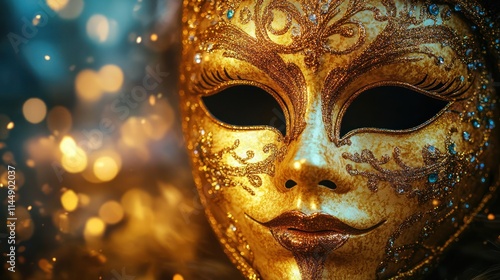 mask, gold, decoration, art, design, beauty, festival, celebration, elegance, mystery, glamour, culture, tradition, adornment, craftsmanship, detail, sparkle, shine, festive, ornate, expression, creativity, portrait, closeup, visual, aesthetic, allure, masquerade, symbolism, heritage, texture, fantasy, charme, illusion, uniqueness, artistry, event, performance, style, sophistication, identity