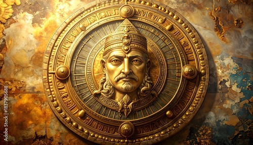 Ornate golden medallion with a regal face, set against an abstract, textured, earthy background