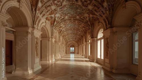 hallway, corridor, interior, architecture, arch, column, ornate, decorative, sunlight, shadow, light, perspective, long, passage, building, historic, ancient, grand, elegant, indoor, pathway, stone, marble, ceiling, vaulted, detailed, travel, tour tourism, heritage, cultural