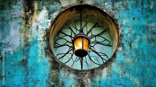 lantern, window, wall, aged, teal, ornate, light, circular, design, historic, light bulb, metal, dark, vintage, rust-eaten, rustic, architecture, detail, pattern, texture, stone, ancient, closeup, light fixture, hole, hanging, illuminated, glowing, exterior, building, rough, cracked, cement, art, decorative, contrast, antique