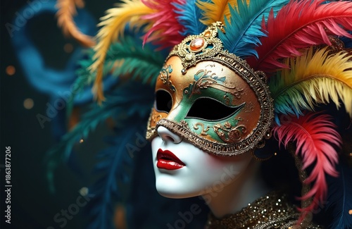 Ornate Venetian mask with colorful feathers and gold accents. Mysterious face hidden behind a decorative, jewel-encrusted face covering. Festive masquerade or carnival attire details.