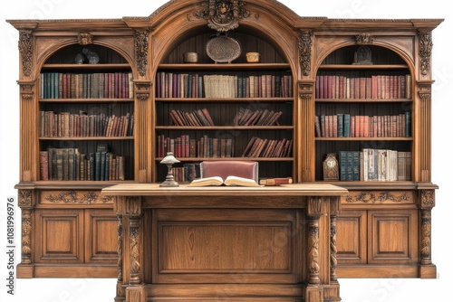 Ornate wooden bookcase and desk with books.