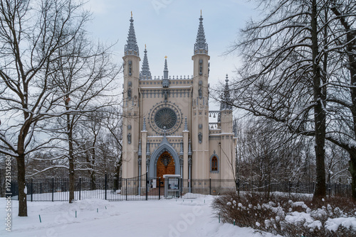 Orthodox Church in Alexandria Park in Peterhof St. Alexander Nevsky Church (Chapel or Gothic Chapel) on a winter day, St. Petersburg, Russia
