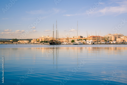 Ortigia, Syracuse, Italy / December 2018: Sailboats and yachts docked at the marina. Turquoise sea water, sunny sky, romantic Italian scenery