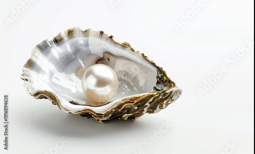 Ostra abierta con perla perfecta y brillante dentro, sobre fondo blanco, concepto de lujo, elegancia, exclusividad, pureza y belleza natural, para imagen de alta joyería