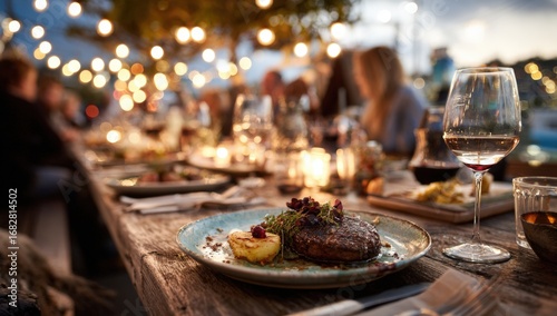 dining, table, food, plated, meal, steak, wine, people, blurred, bokeh, light, evening, dinner, gathering, friends, family, celebration, candle, rustic, wooden, plate, drink, glasses, delicious, appetising, party, warm, illuminated, fresh, epicure, ambience, romantic, elegant, enjoyment, atmosphere, happy, together, social, conversation, beautiful, illumination