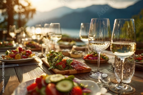 dining, table, wood, wine, goggles, salad, charcuterie, food, summer, sunset, mountain, lake, view, delicious, fresh, healthy, lunch, dinner, rustic, elegant, ambience, beautiful, epicure, celebration, party, scenic, evening, light, sunny, clear, crisp, viewpoint, wooden, plate, cutlery, appetiser, enjoy, cookery, luxury, fine