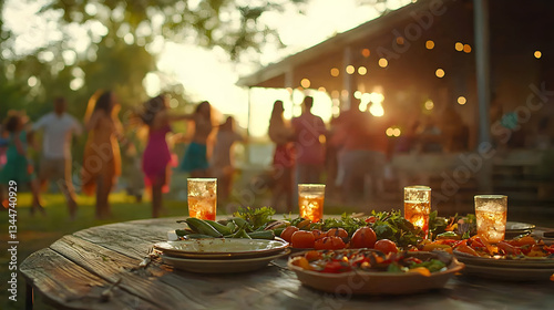party, celebration, gathering, people, friends, summer, drink, food, table, wooden, rustic, sunset, blurred, background, enjoying, fun, happy, social, delicious, plate, goggles, light, gold, warm, evening, cheerful, patio, garden, summer, ambience, socialising, guest, wooden table, warm tones