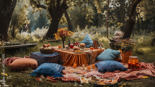 outdoor picnic setup in a lush forest, featuring a low wooden table draped with an orange cloth, surrounded by a vibrant array of cushions and rugs