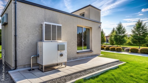 heat, pump, unit, concrete, slab, exterior, wall, modern, suburban, house, home, installation, equipment, system, residential, property, yard, garden, fence, siding, brick, storm, drain, piping, tubing, compressor, fan, coil, condenser, pipe, electrical, connection, wiring, bracket, support, insulation, covering, weather, shield, landscaping, surrounding, grass