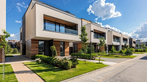 Outdoor view of modern townhouses with clean lines, landscaped lawns, and private parking spaces