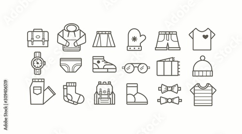 Outline clothes, shoes, glasses, bags, lifestyle stuff. Minimalistic icons, logos. Black and white graphic vector set. Cartoon style, simple flat design. Trendy illustration. Every icon is isolated