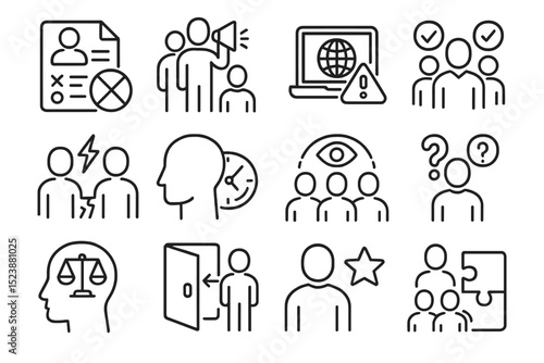 icon, business, communication, team, outline, people, networking, strategy, analysis, leadership, cooperation, collaboration, profile, alert, computer, decision, head, thinking, choice, justice, balance, planning, management, puzzle, connection, group, person, announcement, cyberspace, globe