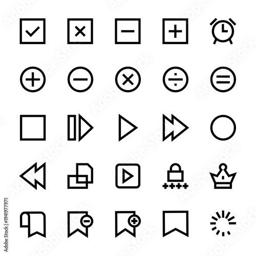 tick, cancel, minus, plus, summing, remove, alarmclock, time, play, forward, fast forward, rewind, backward, stop, record, loading, progress, refresh, repeat, bookmark, favourite, save, badge, award, crown, premium, lock, security, protection, layer, square, circle, navigation