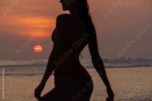 Outline of a sexy girl against the backdrop of the bali island sunset