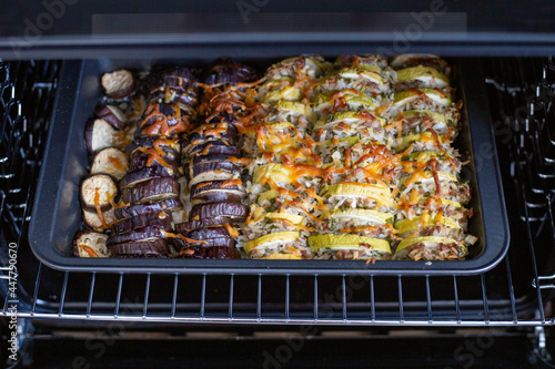 Oven baked zucchini and eggplant with cheese and rice. Vegetable casserole. Vegetarian dish