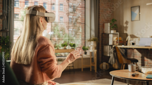 Over the Shoulder Footage of a Female Freelancer Using Virtual Reality Headset and Controllers for Her Project while Sitting on a Couch. Young Woman Working in Futuristic Metaverse App.